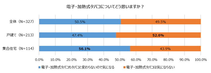 電子・加熱式タバコについてはどう思っているのでしょうか?『電子・加熱式タバコもタバコと変わらないので気になる』(全体:50.5%、戸建て:47.4%、集合:56.1%)、『電子・加熱式タバコは気にならない』(全体:49.5%、戸建て:52.6%、集合:43.9%)となり、喫煙率に比例した結果となりました。