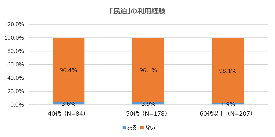 「民泊の利用経験」を聞いたところ、『ある』(40代:3.6%、50代:3.9%、60代以上:1.9%)、『ない』(40代:96.4%、50代:69.1%、60代以上:98.1%)となり、どの年代も利用者はわずかでした。