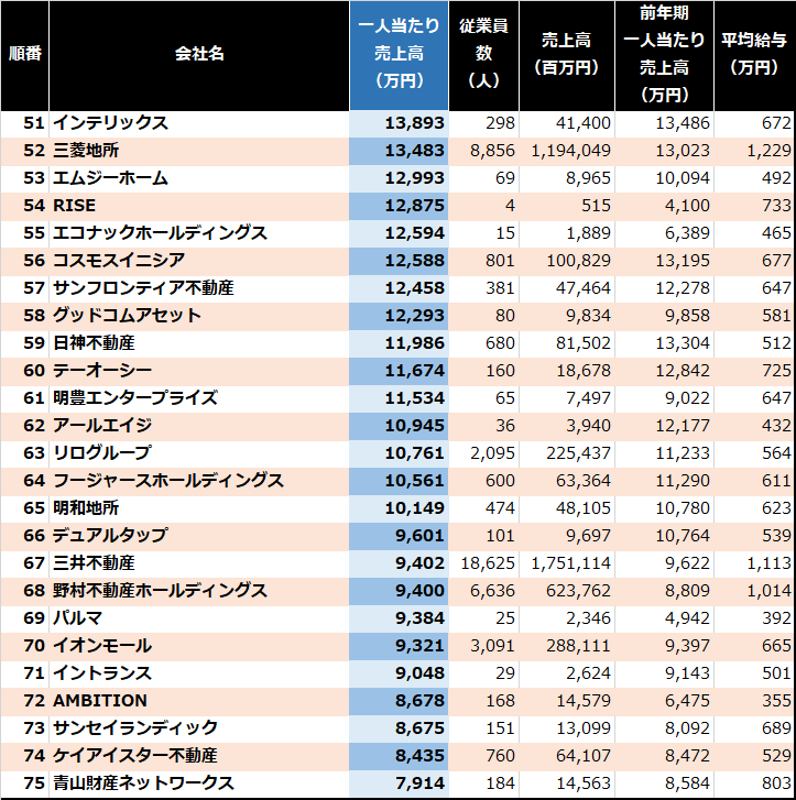 不動産業界 一人当たり売上高ランキング 2018年3月期 51~75位