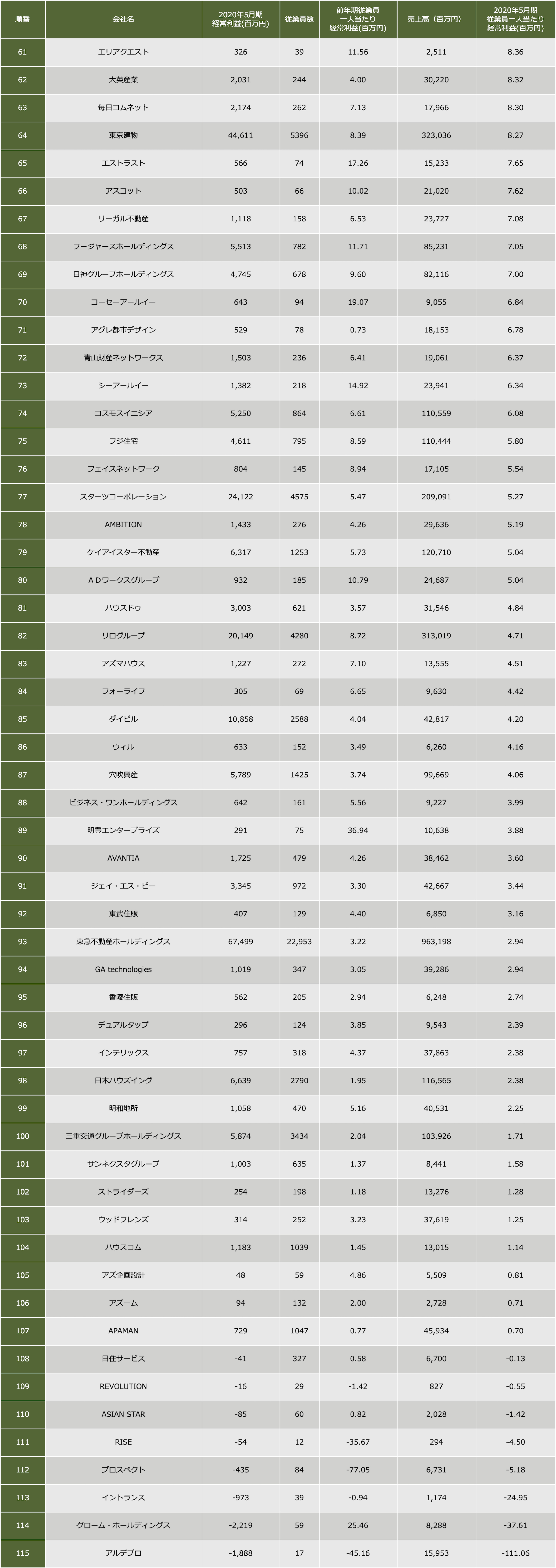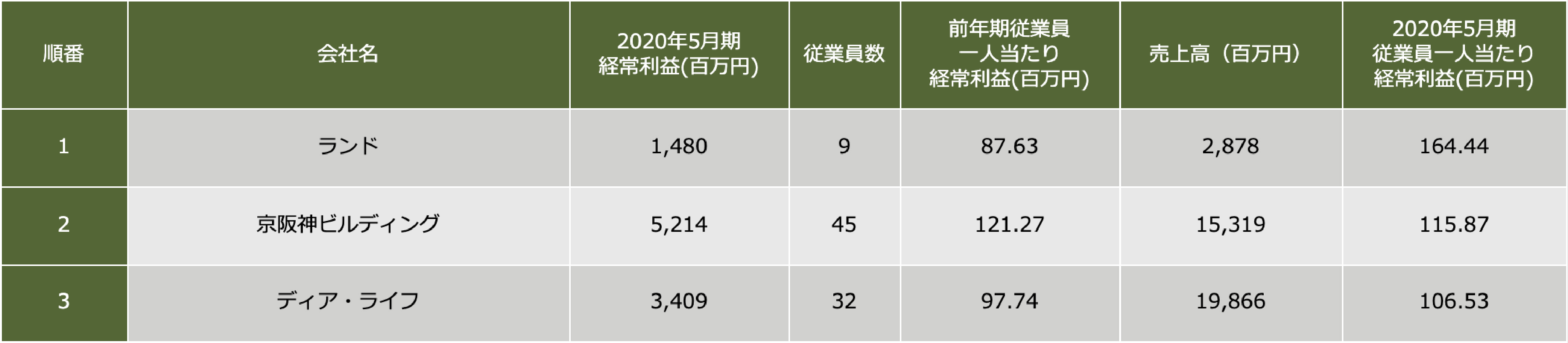 不動産業界 従業員一人あたり経常利益ランキング 2020年
