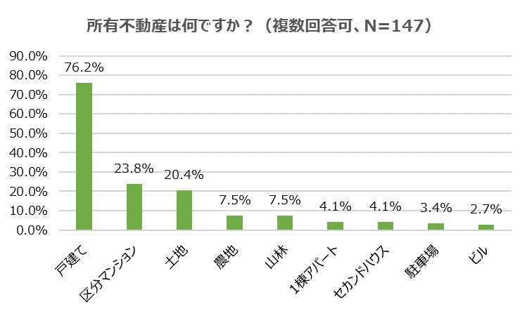 つづいて、「所有不動産の種類」を聞きました。『戸建て』が76.2%と最も多く、『区分マンション』(23.8%)、『土地』(20.4%)、『農地』『山林』(共に7.5%)、『1棟アパート』『セカンドハウス』(共に4.1%)、『駐車場』(3.4%)、『ビル』(2.7%)とつづきました。