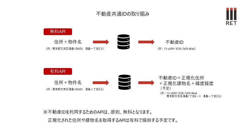 不動産共通IDの提供を通して、各社で管理方法や管理表記の違う不動産情報に対して同一の物件を示す情報に共通のIDを付与し、表記ゆれがある住所と物件名が入力されても、同じIDがレスポンスされる特定技術で物件の特定が容易となるインフラ環境を構築する。これにより住所や物件名などの不動産情報のデータ連携にかかるコストの大幅削減が期待できる。IDの整備は、行政においても長年の課題であり、不動産業界だけでなく、物流業界や行政などにも幅広く応用することができるインフラとなるという。
