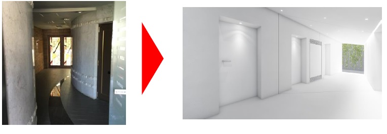 共用部については、エントランスホールでは既存のタイルや建具等を撤去し、床・壁・天井・建具を白に統一することで光を取り込み、明るいイメージにする。