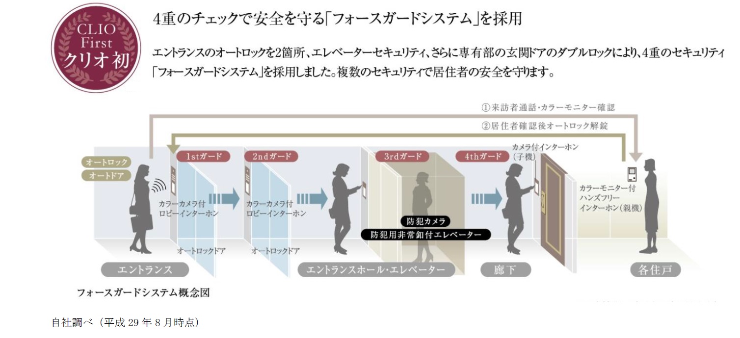 セキュリティ対策も万全で、4重のチェックで安全を守る「フォースガードシステム」、高いセキュリティ性と優れた操作性を備えたハンズフリー機能付きプログレッシブシリンダーキー、さらに全戸防犯センサーを採用し、カメラ付のインターホン子機も装備している。
