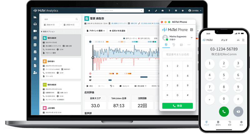 パソコン上から、簡単に通話を発信できるだけでなく、通話内容の録音や文字起こしに加え、ラリーの回数や沈黙、会話の被りや相手との会話の割合、声の強弱や周波数など7つの項目から、通話の内容をスコアリングする。